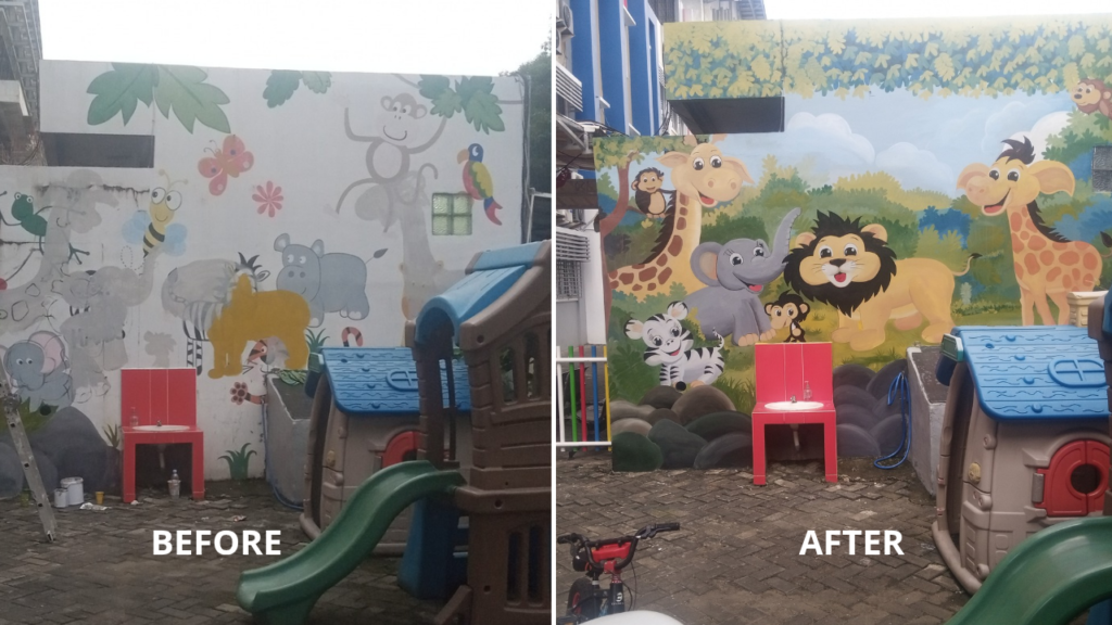 - Daya Tahan Tinggi: Menggunakan cat berkualitas khusus, lukisan dinding mampu bertahan bertahun-tahun tanpa mengelupas atau pudar warnanya.